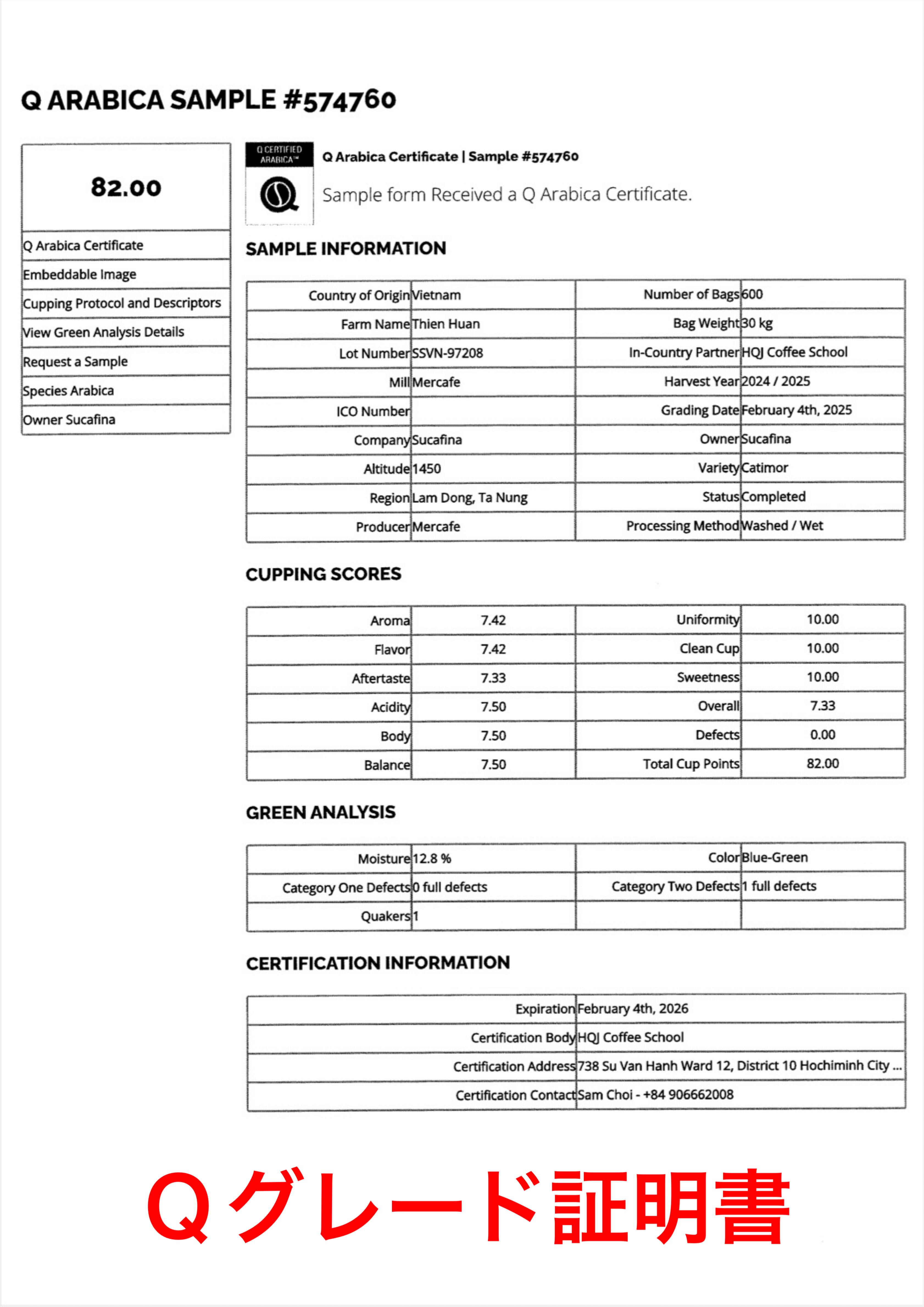 又、本商品は、汎用品ではなく、Qグレード認証にて、82点を獲得しておりスペシャリティ品質のコーヒーとして生産された物となっています。