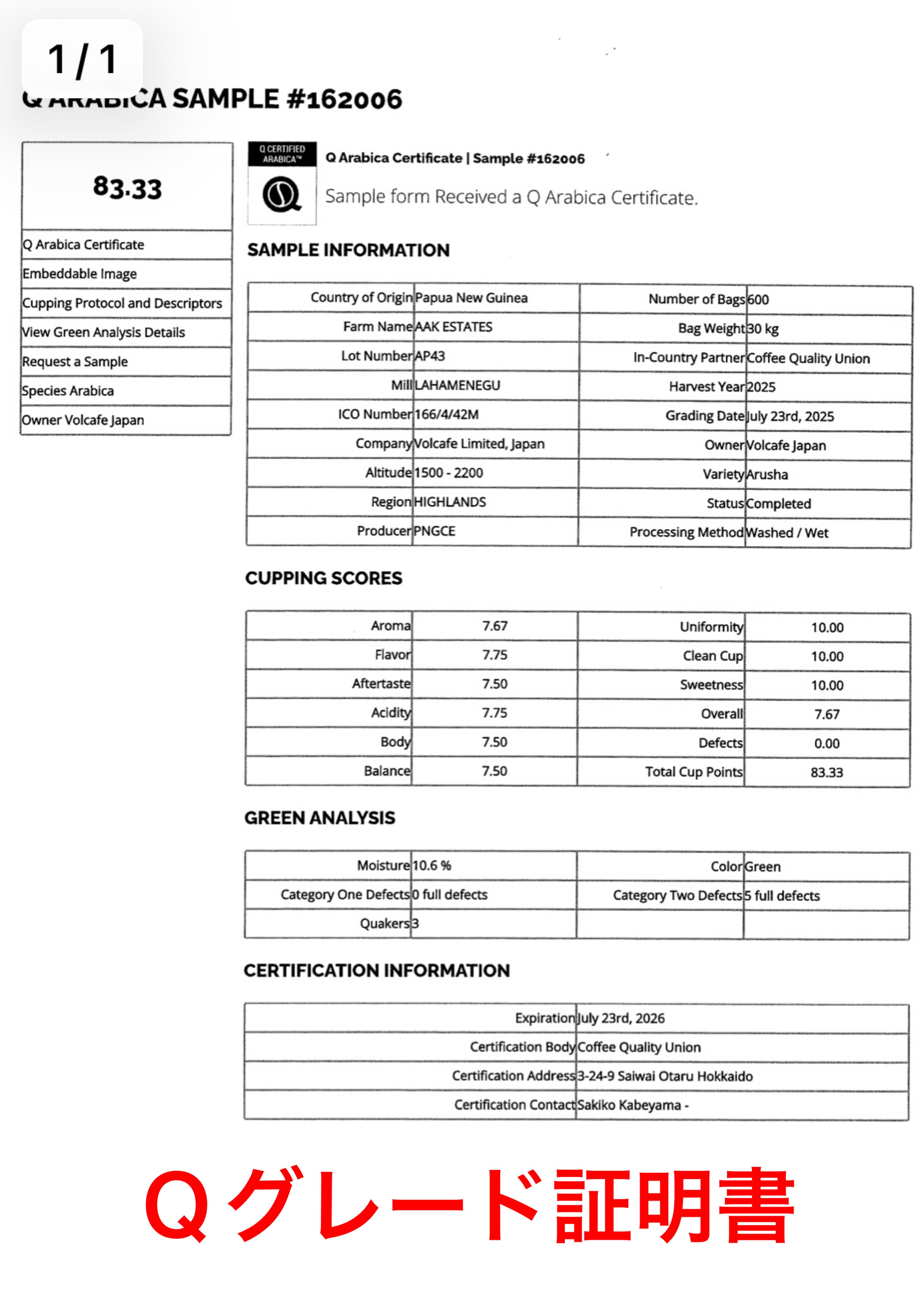 Qグレード認証で83.33点を取っている事からもスペシャルティコーヒーと言ってよい仕上がりになっています。